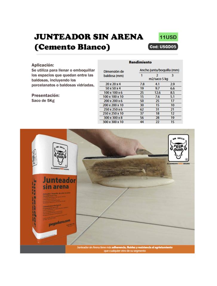 - Pegaduro JUNTEADOR SIN ARENA (Cemento Blanco), bolsa de 5KG-11usd cada bolsa