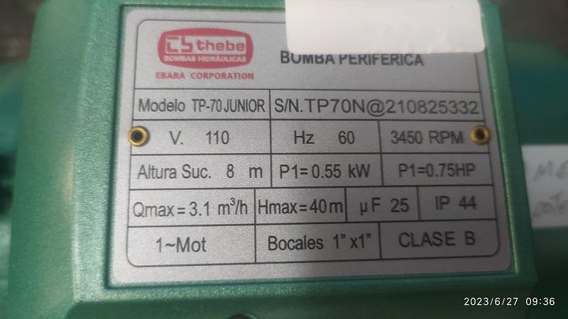 Se vende una bomba de agua nueva en su caja, de 1 caballo de fuerza, sube una altura de hasta 40 metros y una potencia de 0.55 Kw, 1 HP. alimentación de voltaje 110v 60 Hz, distancia de succión o profundidad de la cisterna hasta 8 metros, motor de 3450 rpm. Capacidad de bombeo de 3.1 metros cúbicos por hora. Diámetro de entrada y salida de 1 pulgada. Color verde. Marca THEBE. Bomba periférica.