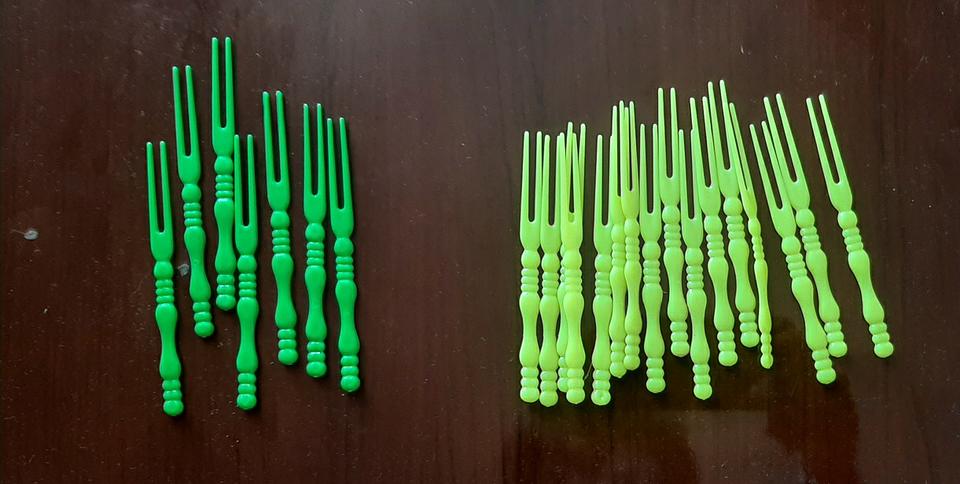 Se venden palillos de plástico para picar saladitos.